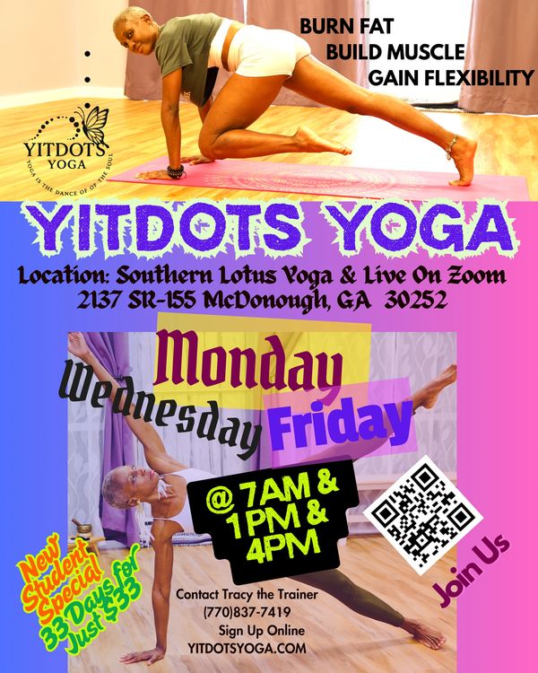 Experience the tranquility and holistic wellness of YITDOTS Yoga with our special new student offer. For just $33, enjoy unlimited access to all of our classes inside of the Southern Lotus Yoga space for 33 days. This special is exclusively for our new students and offers a diverse range of classes, from calming yoga and dynamic Pilates to gentle chair yoga and more. Embrace this opportunity to find your inner peace and enhance your well-being.
